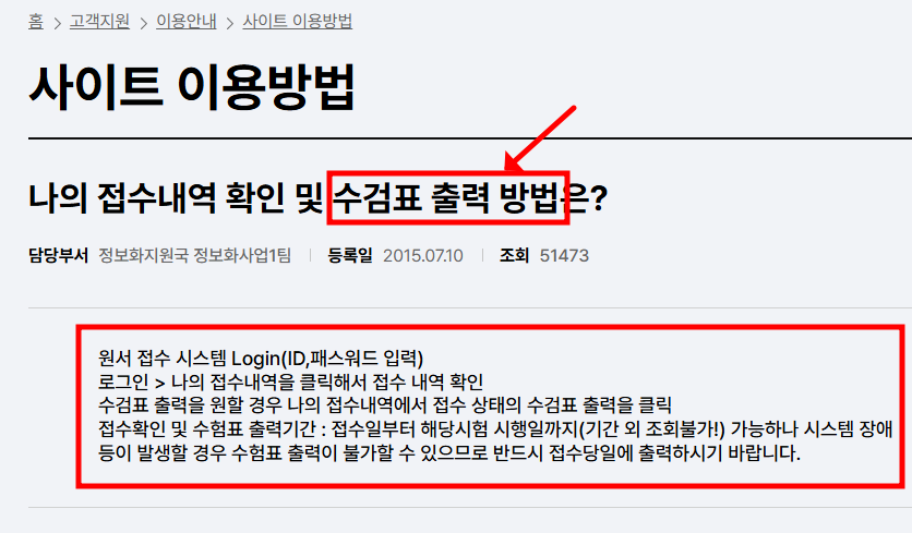 원서접수가 완료되면 수험표를 출력할 수 있습니다. 큐넷 원서접수 홈페이지 바로가기에서 로그인 후 '나의 접수현황' 메뉴에서 수험표를 출력하실 수 있습니다. 수험표에는 시험일시, 장소, 준비물 등 중요한 정보가 기재되어 있으니 반드시 확인하셔야 합니다. 그러나 수험표는 자신의 수험번호 등을 참고하는 정도로 활용하고, 꼭 들고가진 않아도 된다고 합니다.(모바일 수험표도 날아오기 때문) 시험 당일에는 신분증을 꼭 지참하셔야 하니 잊지 마세요.